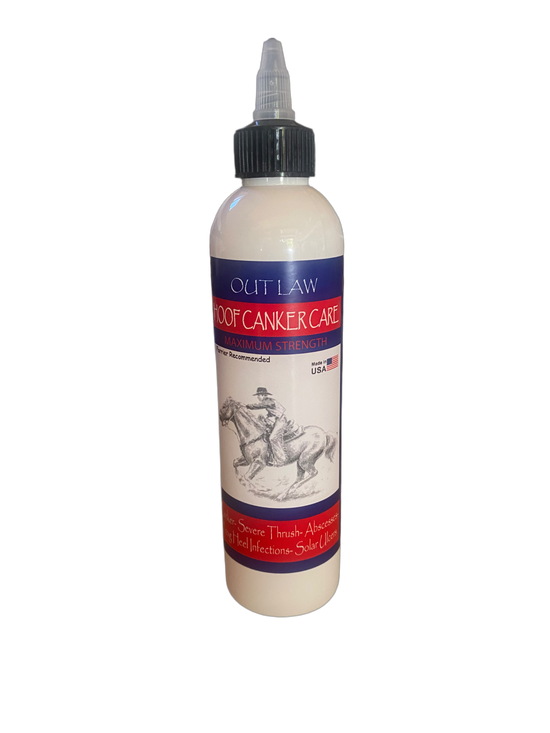 "Hoof infections don’t wait—and neither should you. Outlaw Hoof Canker Care is the professional‑grade topical treatment built tough for the worst cases: canker, abscesses, thrush, and frog or heel ulcerations. Its concentrated formula penetrates deep, wipes out bacteria and fungi, dries out infection, and supports healthy tissue regrowth. Easy to apply, trusted by farriers and vets, and proven to restore hoof integrity. Outlaw Hoof Canker Care—tough on infection, gentle on recovery. Because every step counts."