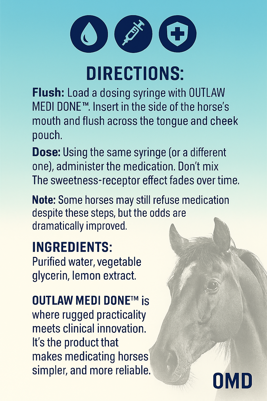 Getting horses to take their prescriptions has always been a battle—crushed tablets hidden in sweet feed, powders mixed with molasses, or pastes forced into the mouth. Too often, the result is wasted medication, stressed horses, and frustrated owners. Outlaw Medi Done™ introduces a breakthrough: a simple oral flush that temporarily changes the horse’s taste receptors so everything tastes sweet. With this new technology, medicating becomes faster, cleaner, and far more reliable.
