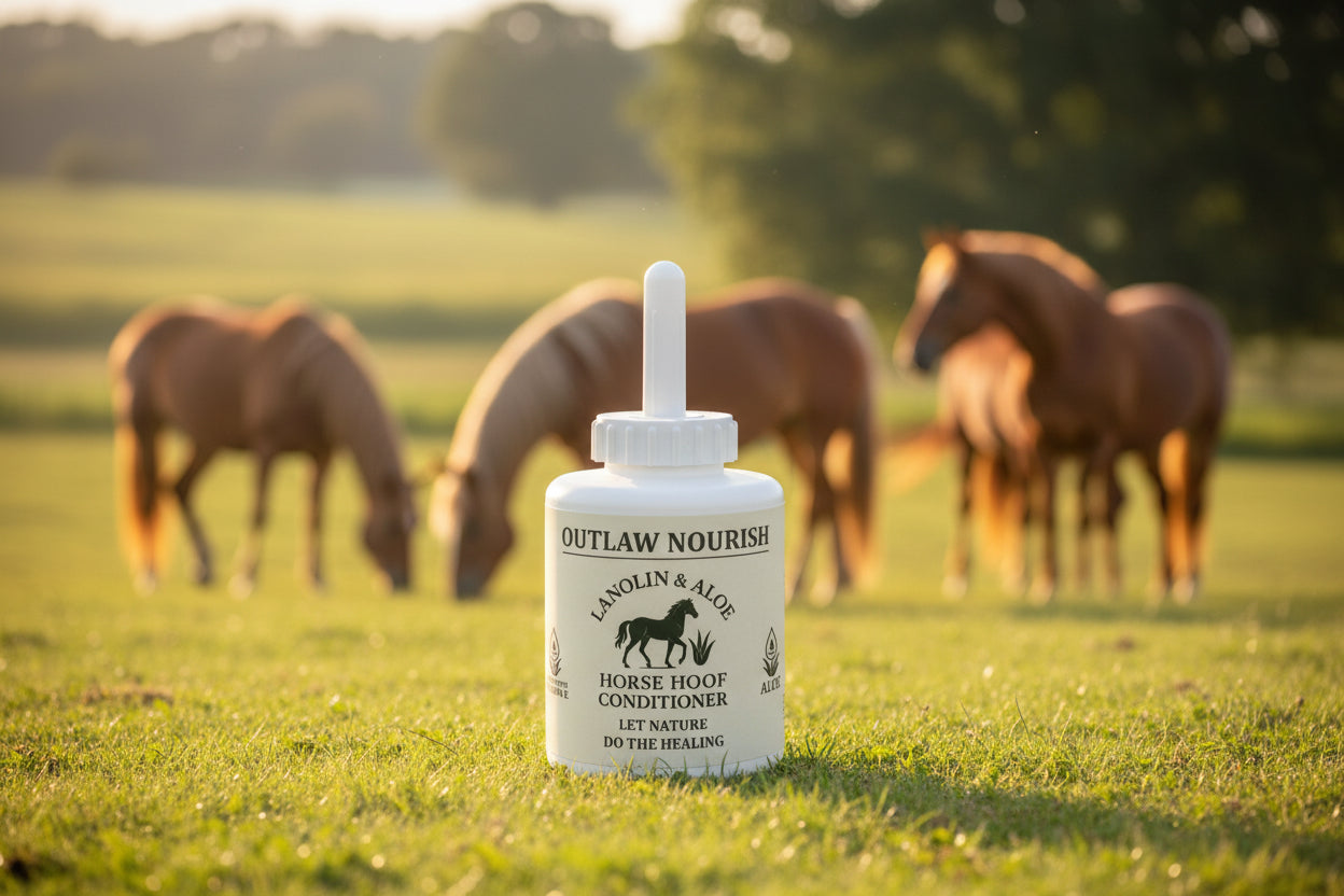 Outlaw Hoof Conditioner is a premium topical formulation combining lanolin, aloe vera, flaxseed oil, and vitamin E. This synergistic blend provides deep hydration, antioxidant protection, and structural support to promote resilient, healthy hooves.